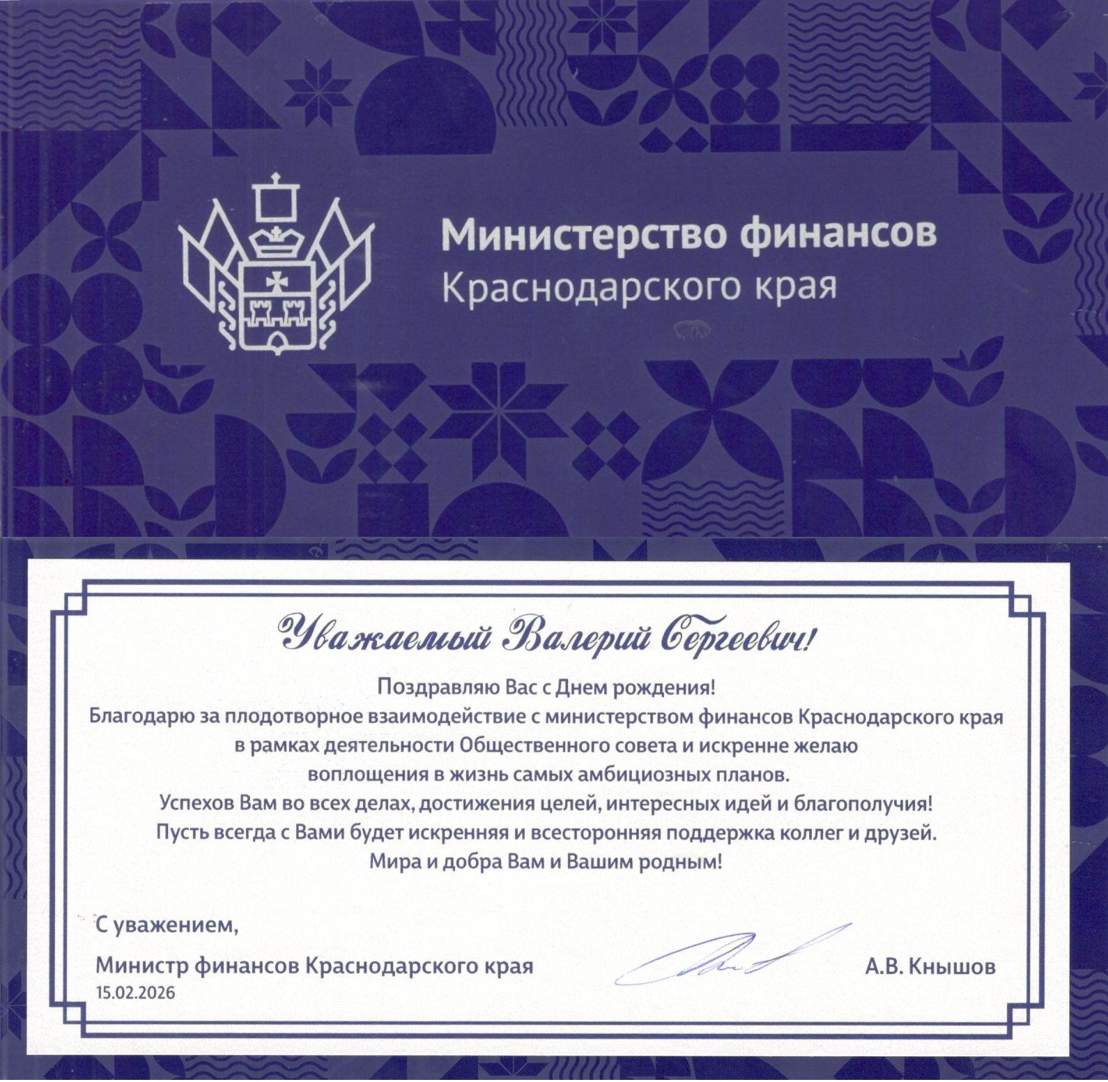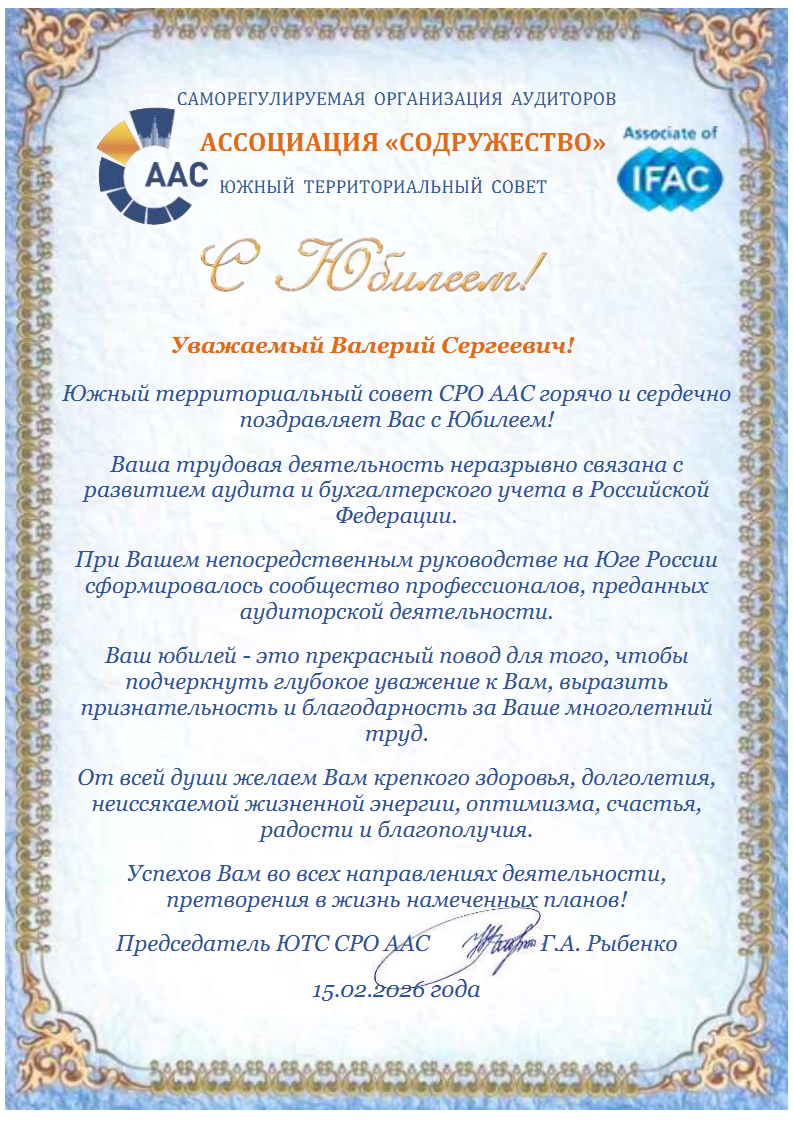 Уважаемый Валерий Сергеевич! Поздравляю с Юбилеем! Желаю сохранять ясность ума, творческий потенциал, позитивный настрой! Пусть Ваши достижения в области развития аудита на Кубани живут и развиваются.